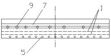 本實施例是一種不銹鋼彎頭保護氣氛熱處理導氣裝置,結構如圖1-3所示,包括箱體、導流板以及聚氣孔,箱體由隔板4分割構成彎管放置區1和保護氣進氣區2,彎管放置區的空腔內安裝測溫探頭3,保護氣進氣區位于彎管放置區的正下方,保護氣進氣區側面下部設有保護氣進氣孔5,保護氣進氣孔由多個沿箱體側面寬度方向并排設置的氣孔組成。在保護氣進氣區內通過導流板6分隔構成往返折流的保護氣進氣通道,保護氣進氣通道的下端與保護氣進氣孔相通,彎管放置區通過均勻分布在隔板上的聚氣孔9與保護氣進氣區相通;箱體側面頂部設有放置管彎頭的開口7,保護氣進氣孔與箱體放置管彎頭的開口設置在同側,通過放置管彎頭的開口7與彎管放置區的空腔相通,彎管放置區的空腔內支撐面上設有多根平行布置的支撐瓷管8,支撐瓷管的布置方向與鋼管彎頭的進出方向垂直。