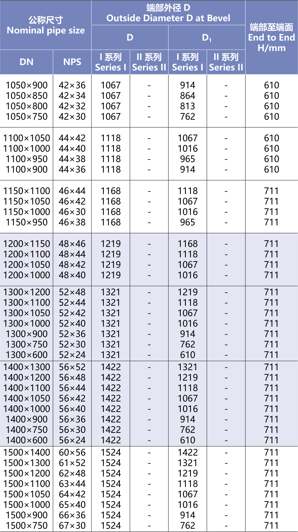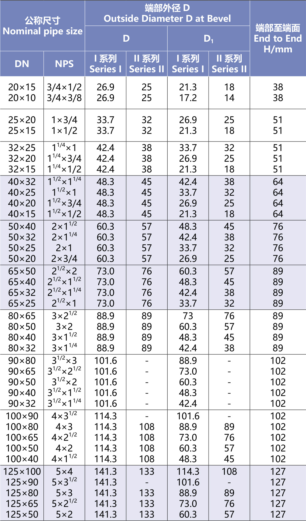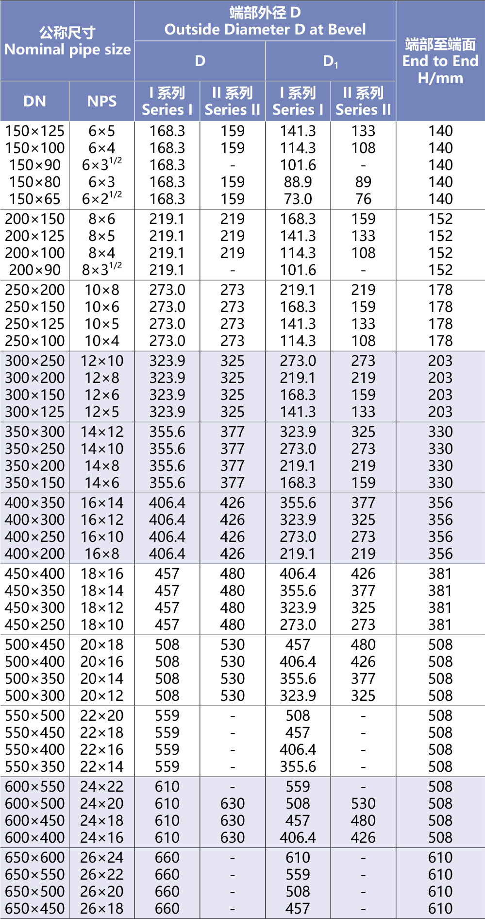 異徑管的質(zhì)量應(yīng)符合現(xiàn)行國(guó)家標(biāo)準(zhǔn)《鋼制對(duì)焊無(wú)縫管件》GB/T12459-2005及《鋼板制對(duì)焊管件》GB/T13401-2005的規(guī)定,異徑管的圓度不應(yīng)大于相應(yīng)端外徑的1%,且允許偏差為±3mm;異徑管尺寸允許偏差應(yīng)符合表4.2.2-3的規(guī)定。異徑管的材質(zhì)執(zhí)行SY/T5037、GB/T9711、GB/T8163、美標(biāo)ASTMA106/A53GRB,API5L、APT5CT、ASTMA105、ASTMA234、ASTMA106、DIN德國(guó)標(biāo)準(zhǔn)及客戶要求標(biāo)準(zhǔn)。
